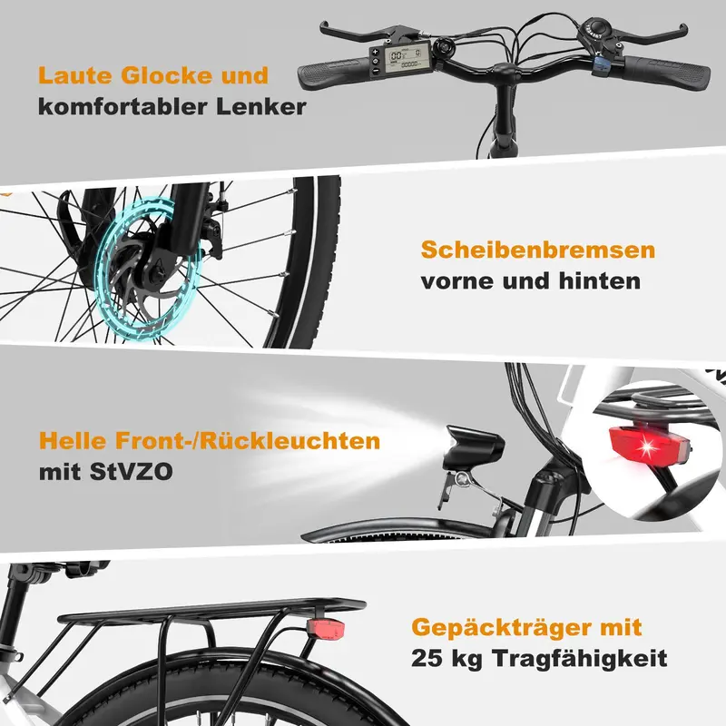 Scheinwerfer (StVzO-konform), das R??cklicht und die Reflexionsstreifen sorgen f??r maximale Sichtbarkeit und ermoglichen eine sichere Fahrt bei Nacht.